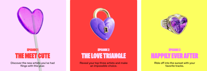 The experience is divided into three episodes. The first episode, titled “Meet Cute,” highlights the new artists users discovered throughout the year. The second episode, “Love Triangle,” features users’ top three artists, while the final episode, “Happily Ever After,” showcases their favorite tracks, along with a personalized playlist for continued listening.